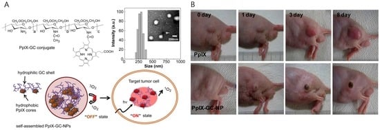 (A) Chemical structure and schematic diagram of protoporphyrin IX (PpIX)-conjugated glycol chitosan nanoparticles for photodynamic therapy (PDT)therapy; (B) result of in vivo PDT therapy by PpIX-conjugated glycol chitosan nanoparticles, compared with that of free PpIX (Adapted with permission from []. Copyright 2011 Elsevier Ltd.)