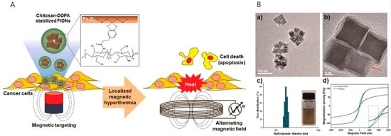 (A) Schematic diagram of ferrimagnetic iron oxide nanocube (FION)-loaded chitosan nanoparticles for hyperthermia of cancer cells; (B) TEM images and physicochemical characterizations of FION-loaded chitosan nanoparticles: (a,b) TEM images of FION-loaded chitosan nanoparticles (red arrow indicates the chitosan polymer coating layers); (c) hydrodynamic diameters of FION-loaded chitosan nanoparticles in phosphate-buffered saline; (d) magnetization curves of FION-loaded chitosan nanoparticles and Feridex® (Adapted with permission from []. Copyright 2012 American Chemical Society).