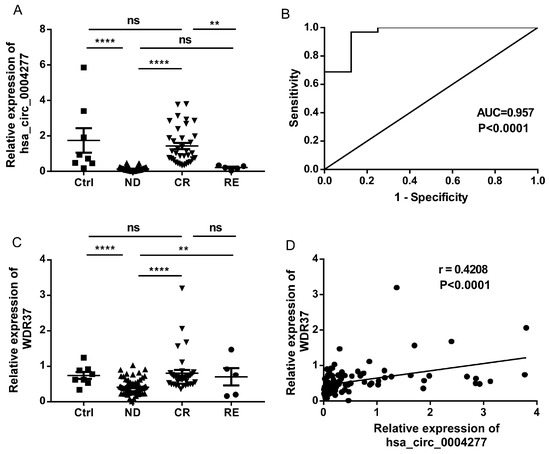 2.6. Effects of Chemotherapy on hsa_circ_0004277 Expression in AML Patients