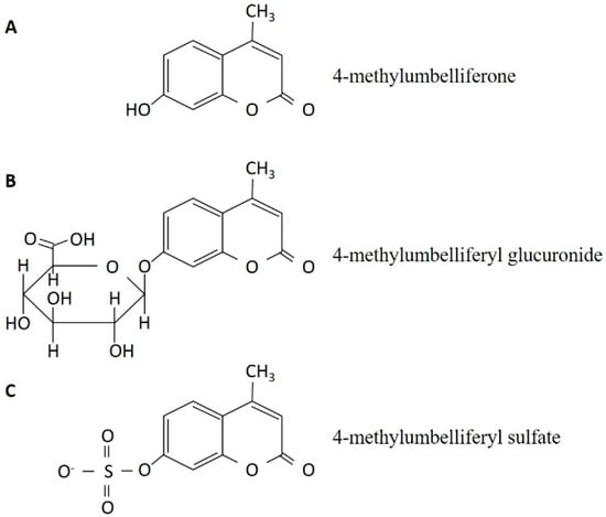 The chemical structure of 4-methylumbelliferone (A) and its metabolites, 4-methylumbelliferyl glucuronide (B) and 4-methylumbelliferyl sulfate (C).