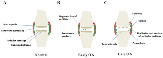 Model of pathologic progression of osteoarthritis (OA). OA is a slow, progressive disease. (A) Normal joint without any damages; (B) Early OA is always difficult to detect, characterized by cartilage degeneration and release of breakdown products into the synovial fluid environment; (C) Late OA is an obvious event, with cartilage loss (fibrillation and erosion of articular cartilage) and osteophyte formation. Damage of the subchondral bone, synovium and capsule may also occur (bone sclerosis, synovitis, and fibrosis, respectively).