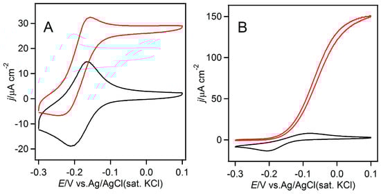 Cyclic voltammograms of (A) 0.1 mM toluidine blue and(B) 0.1 mM 1,4-naphthoquinone in the presence (red) or absence (black) of FAD-GDH (1.0 μM) in a phosphate buffer (pH 7.0) containing 0.1 M glucose. Scan rate of 10·mV·s−1.
