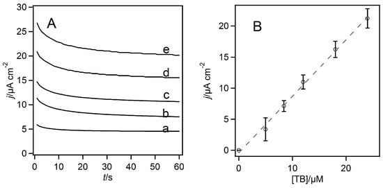 (A) Dependence of the current density on the constant potential electrolysis time for various toluidine blue (TB) concentrations; curves (a) 5.0 μM, (b) 8.4 μM, (c) 12 μM, (d) 16 μM, and (e) 24 μM TB; (B) Dependence of the steady-state catalytic current on the TB concentration. The error bars were evaluated by a Student’s t-distribution at a 90% confidence level. Dashed lines represent the regression line considering the weight of the error.