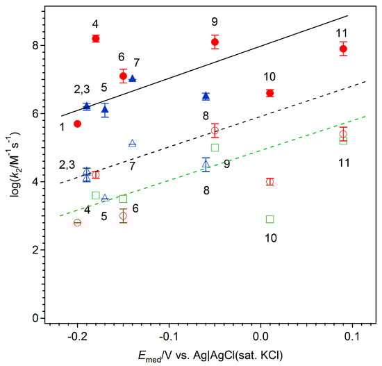 Dependence of the logarithmic bimolecular rate constants for FAD-GDH (closed symbols) and glucose oxidase (open symbols) on the formal potential of the mediators at pH 7.0: MeNQ (1), TB (2), AA (3), PQ (4), MB (5), 14NQ (6), TH (7), MG (8), 12NQ (9), 12NQS (10), and BQ (11). (See Table 1 for the abbreviation definitions.) The error bars were evaluated by a Student’s t-distribution at a 90% confidence level. Phenothiazines are depicted as blue triangles, and quinones are depicted as red circles. The glucose oxidase from the Penicillium vitale–quinone system is shown as green squares []. Black solid, black dashed, and green dashed lines represent the regression lines for FAD-GDH from A. terreus and GOx from A. sp. and GOx from P. vitale [].