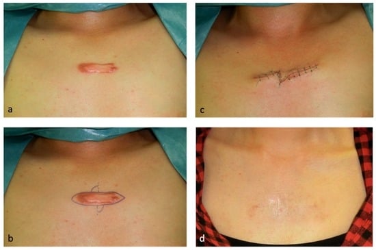 - Ogawa, R.; Akaishi, S.; Huang, C.; Dohi, T.; Aoki, M.; Omori, Y.; Koike, S.; Kobe, K.; Akimoto, M.; Hyakusoku, H. Clinical applications of basic research that shows reducing skin tension could prevent and treat abnormal scarring: The importance of fascial/subcutaneous tensile reduction sutures and flap surgery for keloid and hypertrophic scar reconstruction. J. Nippon Med. Sch. 2011, 78, 68–76. [Google Scholar] [CrossRef] [PubMed]