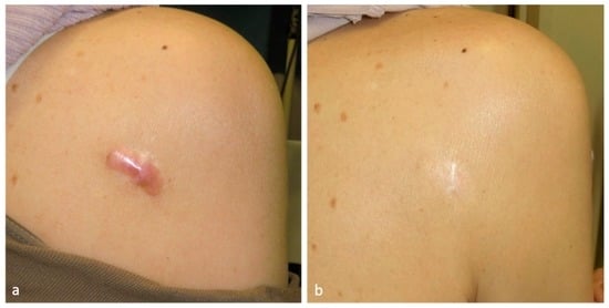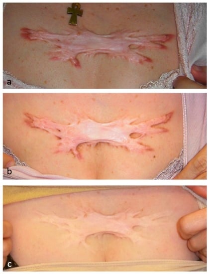 - Ogawa, R.; Akaishi, S.; Kuribayashi, S.; Miyashita, T. Keloids and Hypertrophic Scars Can Now Be Cured Completely: Recent Progress in Our Understanding of the Pathogenesis of Keloids and Hypertrophic Scars and the Most Promising Current Therapeutic Strategy. J. Nippon Med. Sch. 2016, 83, 46–53. [Google Scholar] [CrossRef] [PubMed]
