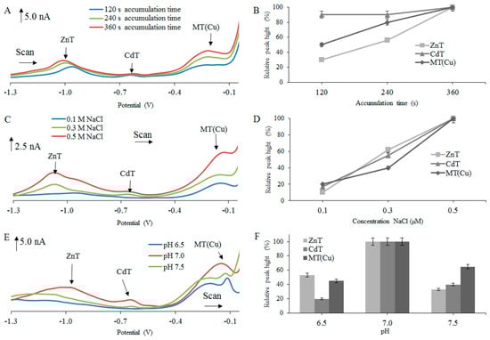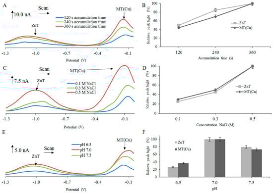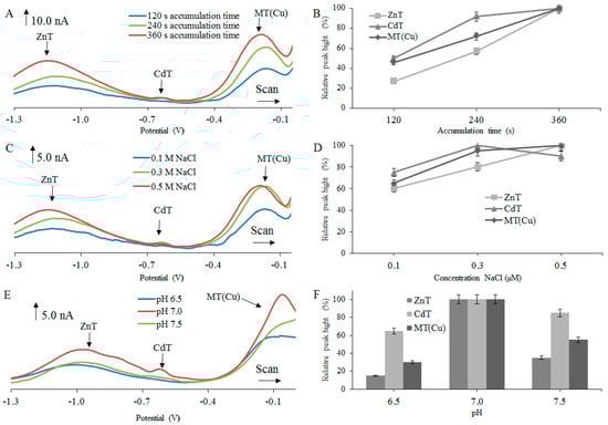 Differential pulse (DP) voltammograms of 2 µM rabbit MT2 protein (rMT2) measured in different (A) accumulation times, (C) concentration of NaCl, and (E) pH. Adsorptive transfer stripping technique coupled with differential pulse voltammetry (AdTS DPV) parameters were as follows: initial potential −1.5 V, end potential 0.0 V, modulation time 0.057 s, time interval 0.2 s, step potential of 1.05 mV/s, and modulation amplitude of 25 mV. Dependences of heights of ZnT, CdT, and MT(Cu) signals on (B) accumulation times of 120 , 240 , 360 s; (D) concentration of electrolyte (0.1, 0.3, 0.5 M); and (F) pH (6.5, 7.0, 7.5), expressed in relative percentage peaks and peak height (nA).