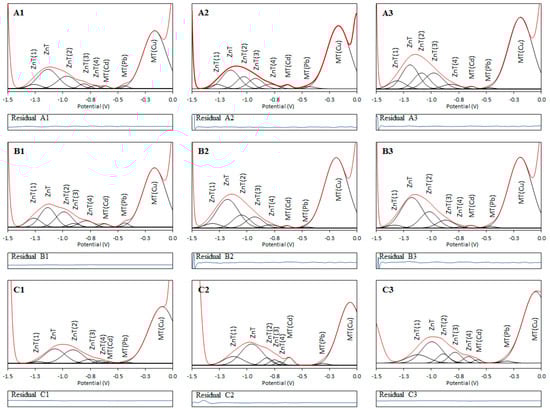 All performed measurements provided non-resolved voltammograms with broad signals. The character of measured voltammetric curves, however, in almost all cases, exhibited the presence of more than three basic signals, discussed and evaluated in Figure 1, Figure 2 and Figure 3. It is obvious that voltammetric curves are the result of superposition of electrochemical signals which are very close to each other and which very probably belong to different MT complexes with different metal ions. To distinguish each of these strongly overlapping signals and to obtain separated peak heights and positions, the curve-fitting method was employed, as it is further described.