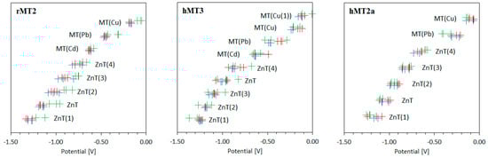 A characterization of metal–MT complexes by using electrochemical methods, specifically by differential pulse voltammetry (DPV), was the main aim of this study. The influence of individual MT isoforms on electrochemical response was the main tested parameter. Electrochemical analyses were carried out in the presence of 0.5 M NaCl as a supporting electrolyte. Previous studies showed that MTs analyzed by using DPV provides a number of electrochemical signals assigned as: MT(Cd), MT(Cu), CdT’, ZnT’, CdT, and ZnT, which belong to various complexes of MTs with metal ions present in the analyzed solution [,,]. Together with abovementioned signals, the voltammograms can contain the redox signals of free ions of Cd2+ and Zn2+ [,,]. In such a case, the presence of MTs is confirmed by an evaluation of selected peaks, named as follows: ZnT, CdT, and MT(Cu).
