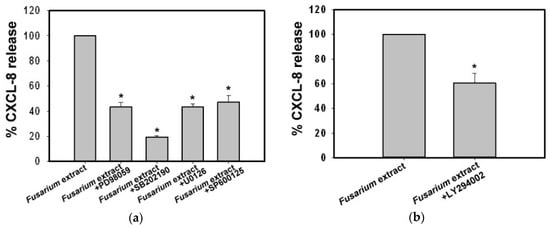 2.4. Involvement of the Mitogen-Activated Protein Kinases, phosphatidylinositol-3-kinase and Nuclear Factor κ-Light-Chain-Enhancer of activated B cells in Fusarium proliferatum-Induced CXCL8 Release