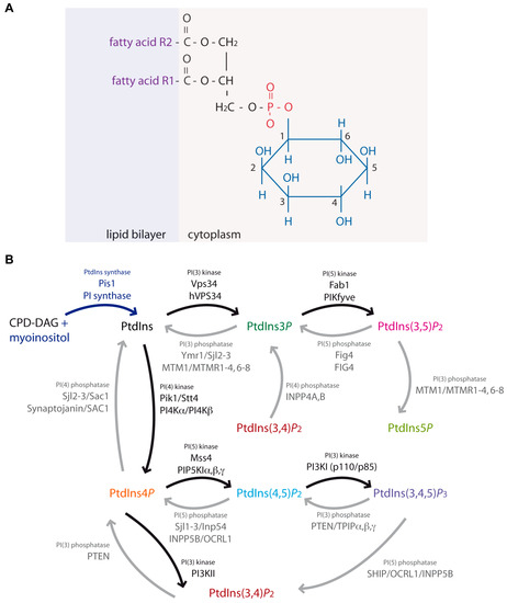 Phosphoinositides synthesized in yeast Saccharomyces cerevisiae (S. cerevisiae) and in human cells with the enzymes involved. (A) The chemical structure of phosphatidylinositol (PI); (B) Phosphorylation reactions are represented with black arrows and dephosphorylation reactions by grey arrows. The name of the yeast enzyme (when relevant) is written on top of its human homologue.