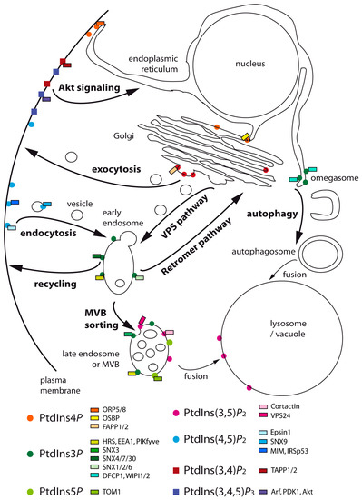 Intracellular localization of the different phosphoinositides and the membrane trafficking pathways. The different phosphoinositides (PPIn) are represented by symbols: circles for PPIn involved in intracellular trafficking with the corresponding steps they regulate; squares for PPIn involved in cell signaling, the latter being absent from yeast. The human proteins interacting with the different PPIn are represented by a rectangle. The MVB stands for multivesicular body and the VPS for vacuolar protein sorting.