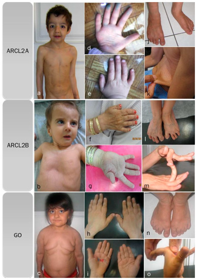 Patients with GO have normal mentation, whereas the majority of the patients with ARCL2A and ARCL2B have variable degrees of intellectual disability. While patients with ARCL2B may manifest osteopenia, osteopenia that is severe enough to cause pathologic fractures is more characteristic of GO. Facial features specific to GO are maxillary hypoplasia and oblique furrowing from the outer canthus to the lateral border of the supraorbital ridge.