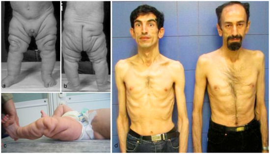 Clinical findings vary as the children with these cutis laxa syndromes grow older. At birth, the ARCL2B patients are usually very small with many having intrauterine growth retardation. The adult ARCL2B patient, however, is not particularly short but usually has a low weight and exhibits lipodystrophy (Figure 2c). ARCL2B infants have very thin skin, visible veins over thorax and clenched hands, but these symptoms improve considerably as the patient grows older (Figure 2d–f). Infants with GO usually have normal birth weights and lengths. The progeroid features improve in the majority of patients as the child grows older and reaches adult age. This progression is most obvious in ARCL2A (Figure 2a) [5,7,17]. Contrary to the improvement in the progeroid features, the abnormal fat distribution seen in ARCL2A worsens with age (Figure 3a–c) [4].