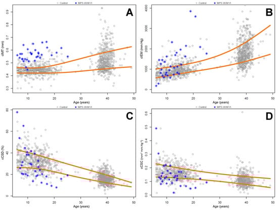 Scatter plots of carotid measurements from MPS cohort (blue stars), pediatric, and adult control cohorts (gray circles) versus age. (A) Carotid intima-media thickness; (B) carotid incremental elastic modulus; (C) carotid cross-sectional distensibility; (D) carotid cross-sectional compliance. The orange lines in each panel denote the 20th (lower) and 80th (upper) percentiles of control cohort measurements.