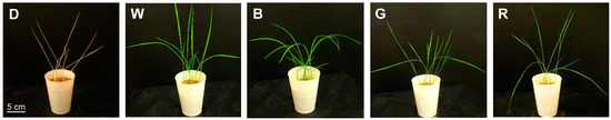 Rice (Oryza sativa cv. Dongjin) seeds were germinated at 25 °C under dark condition for five days before irradiation. Then, the rice seedlings were grown under various types of light-emitting diodes (LEDs; Union LED Electronic Co., Siheung-si, Korea) for 10 days. In each cycle, about 100 seedlings were used for each LED treatment. Each LED treatment was conducted in separately controlled chambers to be free from spectral interference among treatments. The LED array chambers were programmed to provide a 14-h-light/10-h-dark photoperiod at photosynthetic photon flux maintained of approximately 150 μmol·m−2·s−1. The rice seedlings were grown under four different light sources (Supplemental Table S1) with broad spectrum-white LED (420−680 nm) as a control, blue LED (460−490 nm), green LED (520−550 nm), and red LED (620−650 nm), or under constant dark conditions. For pigment and RNA samples, shoot parts of rice seedlings were sampled at 4 h after illumination (11 AM) on the last day of LED treatments.