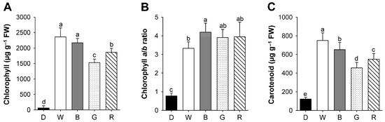 Effects of different wavelengths of LEDs on the content of total chlorophyll (A); chlorophyll a/b ratio (B); and carotenoid (C) in rice seedlings. The plants were subjected to the same treatments as in Figure 2, and treatment notations are the same as in Figure 2. The data represent the mean ± SD (n = 6). Means denoted by the same letter did not differ significantly at p < 0.05 according to Duncan’s multiple range test.