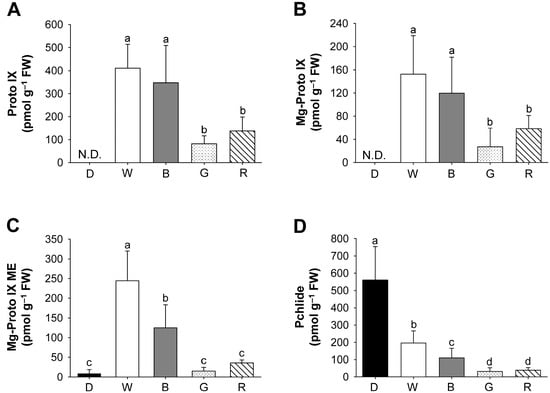 Effects of different wavelengths of LEDs on the distribution of porphyrin intermediates. (A) Proto IX; (B) Mg-Proto IX; (C) Mg-Proto IX ME; and (D) Pchlide. The plants were subjected to the same treatments as in Figure 2, and treatment notations are the same as in Figure 2. N.D., not detected. The data represent the mean ± SD (n = 6–8). Means denoted by the same letter did not differ significantly at p < 0.05 according to Duncan’s multiple range test.