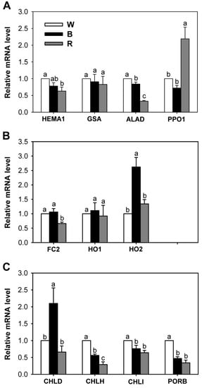 Effects of different wavelengths of LEDs on the expression of genes encoding the porphyrin pathway enzymes. (A) Common branch; (B) Fe-porphyrin branch; and (C) Mg-porphyrin branch. The plants were subjected to the same treatments as in Figure 2. Treatment notations are the same as in Figure 2. Total RNAs were purified from plants and reverse transcribed. The resultant cDNAs were used as templates for qRT-PCR using Actin as an internal control. The white LED (control) was used for normalization, with the expression level of the sample set to 1. Error bars indicate SEM from three independent experiments (n = 3); each experiment has three biological replicates. Means denoted by the same letter did not differ significantly at p < 0.05 according to Duncan’s multiple range test.