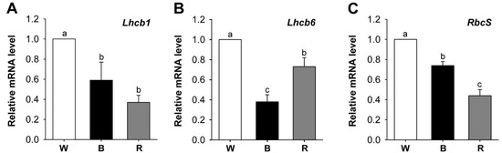 Effects of different wavelengths of LEDs on the expression of nuclear-encoded photosynthetic genes encoding the chlorophyll-binding proteins. (A) Lhcb1; (B) Lhcb2; and (C) RbcS. The plants were subjected to the same treatments as in Figure 2. Treatment notations are the same as in Figure 2. Total RNAs were purified from plants and reverse transcribed. The resultant cDNAs were used as templates for qRT-PCR using Actin as an internal control. The white LED (control) was used for normalization, with the expression level of the sample set to 1. Error bars indicate SEM from three independent experiments (n = 3); each experiment has three biological replicates. Means denoted by the same letter did not differ significantly at p < 0.05 according to Duncan’s multiple range test.