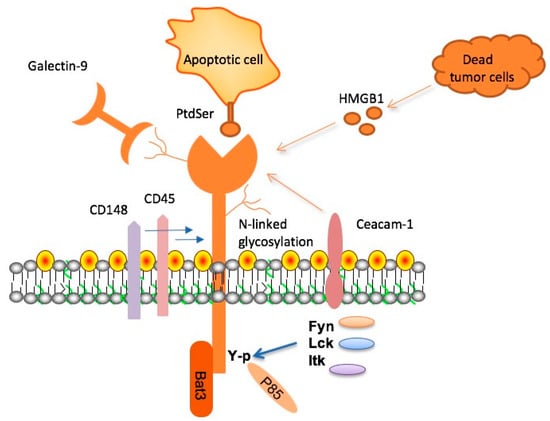 - Nakayama, M.; Akiba, H.; Takeda, K.; Kojima, Y.; Hashiguchi, M.; Azuma, M.; Yagita, H.; Okumura, K. TIM-3 mediates phagocytosis of apoptotic cells and cross-presentation. Blood 2009, 113, 3821–3830. [Google Scholar] [CrossRef] [PubMed]