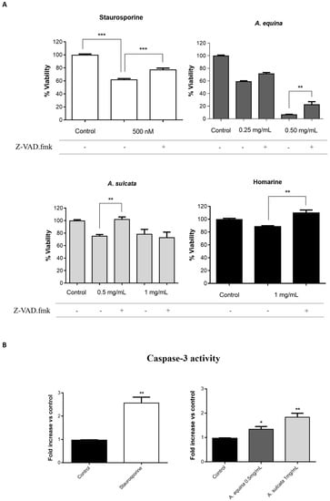 AGS and RAW 264.7 cells were cultured in 96-well plates as described for the MTT assay and allowed to attach for 24 h. After incubation, cells were pre-incubated with Z-VAD.fmk (AGS and RAW 264.7 cells) (50 µM) for 1 h and then extracts (0.25 and 0.5 mg/mL of A. equina and 0.5 and 1 mg/mL of A. sulcata) or homarine (1 mg/mL) were added and incubated for 8 h at 37 °C. After this, MTT assay was conducted.