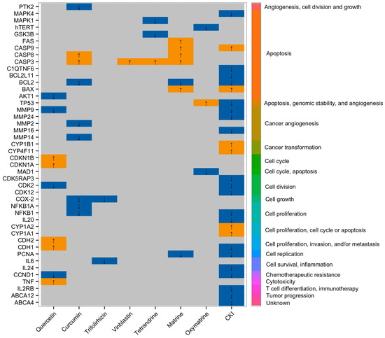 Differential gene expression in different cancer cell lines induced by flavonoids and alkaloids as well as Compound Kushen Injection (CKI). Left hand axis shows differentially expressed genes, bottom axis shows natural anti-cancer agent treatments (Quercetin, Curcumin, Trifolirhizin = flavonoids), (Vinblastine, Tetrandrine, Matrine, Oxymatrine = alkaloids), and (compound mixture = CKI) and the right hand axis shows Gene Ontology (GO) clustering and annotation of differentially expressed genes. Up and down-regulated genes (up = YELLOW and down = BLUE) known to be affected by natural compound anti-cancer agents were obtained from http://crdd.osdd.net/raghava/npact/browse.php and significantly differentially expressed genes from CKI treated MCF-7 cells were obtained from RNA-Seq experiments conducted by Qu et al. [87].