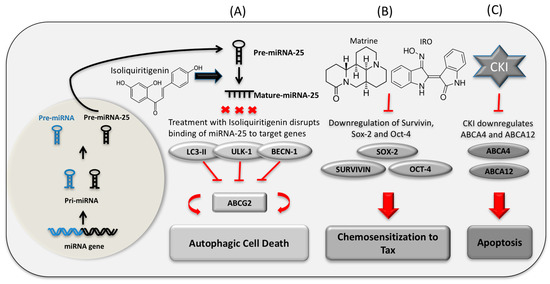 Three panels (A–C) show the influence of natural compounds on gene expression in terms of MDR regulation. (A) Treatment of Isoliquiritigenin blocks binding of autophagy-related miR-25 to the 3′ UTR region of ULK-1, LC3-II, and BECN-1 in killing drug-resistant breast cancer cells [133]; (B) Matrine and indirubin-3′-monoxime (IRO) reverse chemoresistance of paclitaxel (TAX) by downregulating the expression of Sox-2, Survivin, and Oct-4 proteins in human squamous cell carcinoma [134]; (C) CKI suppresses the expression of the drug resistant related genes ABCA12 and ABCA4 in cancer cell apoptosis. The involvement of miRNAs in the regulation of these genes with respect to drug resistance has not yet been confirmed [87].