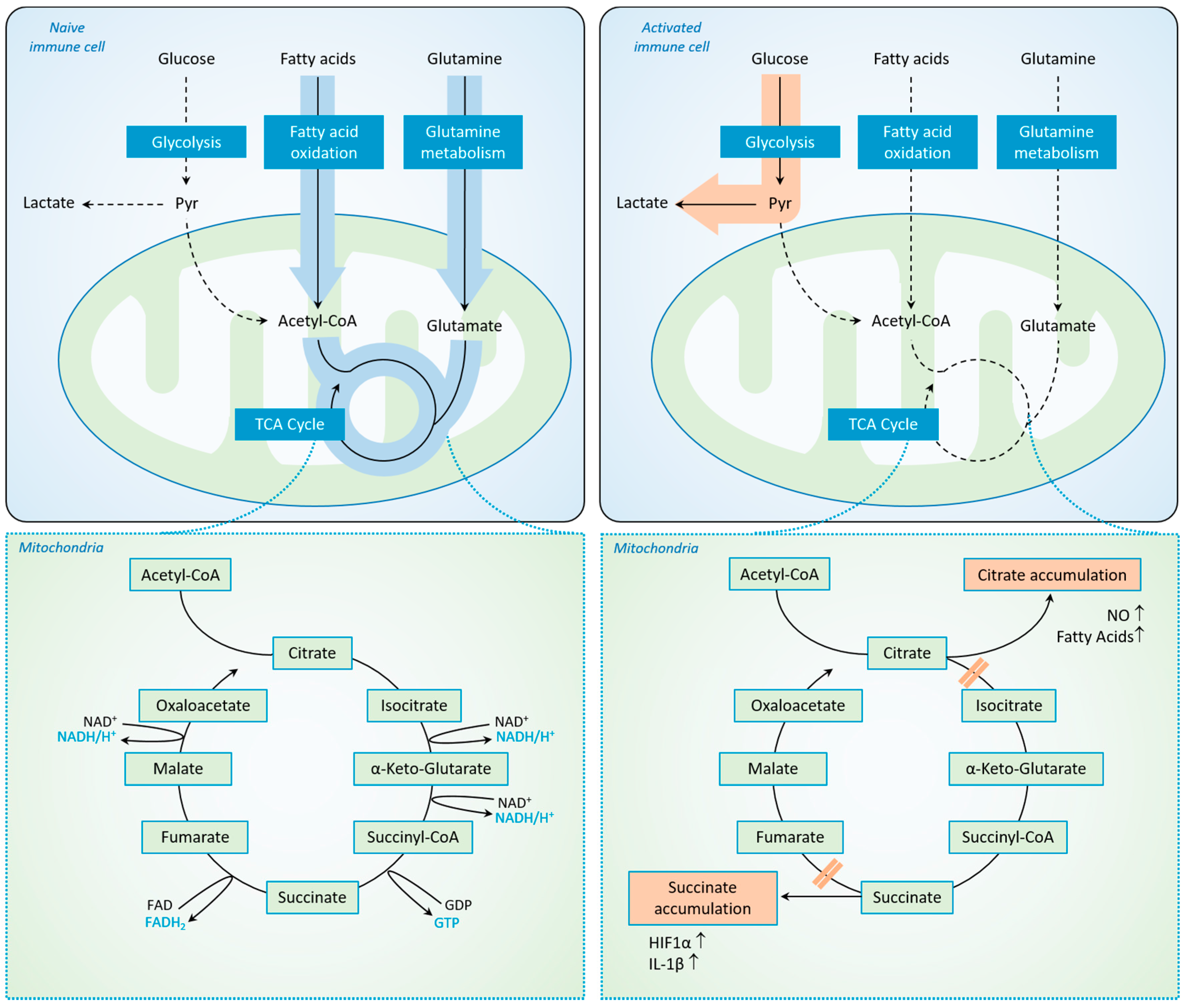 The “Warburg effect” in activated immune cells. Visualization of the interaction of glycolysis and the tricarboxylic acid cycle (TCA) pathway in naive (left side) and activated (right side) immune cells. While energy production relies on the TCA in native immune cells (solid arrows highlighted in blue) and Glycolysis is of minor importance (dashed arrows left side), the TCA is blocked on two breaking points in activated immune cells, which results in citrate and succinate accumulation. As a result, energy production in activated immune cells relies on Glycolysis (solid arrows highlighted in orange) while the TCA is of minor importance (dashed arrows). Upward arrows symbolize increased levels. Abbreviations: Pyr = Pyruvate, NADH = Nicotinamide adenine dinucleotide (NAD+ in its oxidated form), GDP/GTP = Guanosine diphosphate/Guanosine triphosphate, HIF1α = Hypoxia-inducible factor 1-α, IL-1β = Interleukin 1 β, NO = nitric oxide.