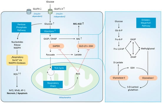Mammals primarily detoxify MG via the glyoxalase pathway, which involves enzymes such as glyoxalase-I (GLO-I) and glyoxalase-II (GLO-II) [,]. These enzymes metabolize MG into lactate by using NADPH and glutathione [,]. Glyoxalase was first described in 1913 [,], but despite a hundred years of research [], little is known about the actual mechanisms of its regulation. However, this way of MG detoxification seems to be severely disrupted in critical illness (Figure 2).