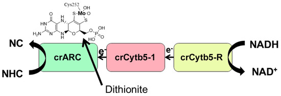 The first ARCO studied in detail in the plant kingdom was in the alga (Chlamydomonas reinhardtii) (Chlamydomonas). We found that Chlamydomonas ARCO is the Mo enzyme crARC, the cytochrome b5-1 (crCytb5-1) and one NADH cytochrome b5 reductase (crCytb5-R) (Figure 1), similar to its human counterpart and different from the two components in a prokaryotic system [17]. The Chlamydomonas ARCO is able to reduce HAP to adenine, shows a Zn2+-dependent activity that increases its Vmax more than 14-fold, and belongs to the SO family since its Cysteine 252 was identified as a putative ligand of the Mo atom [17] (Figure 1).