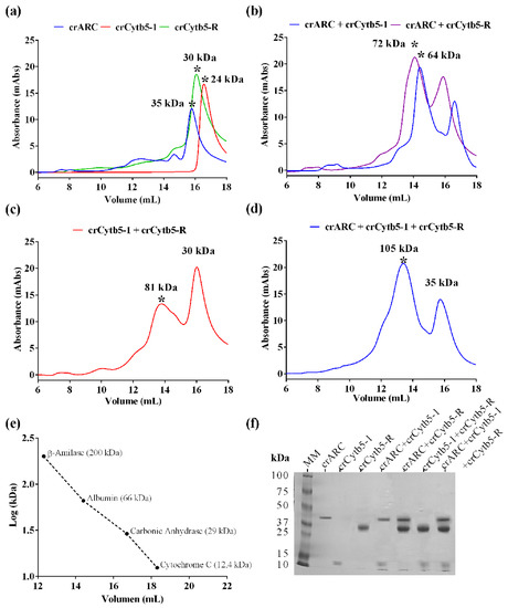 Interaction studies between crARC, crCytb5-1 and crCytb5-R. The SEC profiles of the indicated samples are shown. In these experiments, the proteins crARC, crCytb5-1 and crCytb5-R were loaded separately and then together in different combinations to observe the appearance of new peaks. (a) The proteins loaded separately; (b) crARC, with crCytb5-1, and crARC with crCytb5-R; (c) The crCytb5-1 protein with crCytb5-R; (d) The proteins crARC plus, crCytb5-1 and crCytb5-R together; (e) Calibration curve obtained using the Mw protein marker; the graph represents the Mw versus the logarithm of the elution volume. The absorbance was measured at 280 nm; (f) sodium dodecyl sulfate (SDS)-polyacrylamide gel electrophoresis of the protein peak indicated with the symbol * obtained in the SEC.