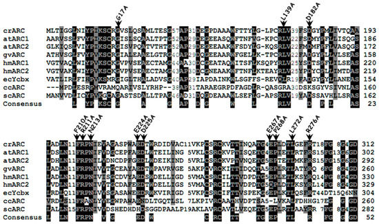 Multiple-sequence alignment of different mARC proteins. The sequences and accession numbers (shown into parentheses; GenPept accession numbers begin with XP and NP; others are proteins deduced from GenBank sequences) are as follows: crARC, Chlamydomonas reinhardtii mARC (XP_001694549); atARC1, Arabidopsis thaliana mARC1 (NP_174376); atARC2, Arabidopsis thaliana mARC2 (NP_199285); gvARC Gloeobacter violaceus PCC 7421 mARC (NP_926027); hmARC1, human mARC1 (Homo sapiens) (NP_073583); hmARC2, human mARC2 (NP_060368); YcbX, Escherichia coli YcbX (NP_415467); ccARC, Caulobacter crescentus mARC (AAK22857); and scARC, Streptomyces coelicolor A3ARC (CAC04053). The positions of residues mutated to alanine in crARC are indicated by the black arrowheads. Highly conserved amino acids are shown on a black background, and moderately conserved amino acids are shown on a gray background. The consensus sequences have been calculated with a threshold of 75% with the BioEdit v.7.0.9 program (Reprinted with permission from [17]).