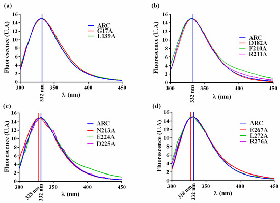 The substituted amino acid should not perturb the overall folding of the crARC protein, and if it happens, the mutant should be discarded. Therefore, to find out whether the overall tree dimensional (3D) crARC structure of these 11 mutants had changed compared with the wild type, the fluorescence spectrum of aromatic amino acids of those proteins was compared to that of the wild type. As crARC has 10 tryptophans distributed along its sequence, if any of the substitutions affect the folding of the protein, its fluorescence spectrum will be altered. Therefore, the maximum of fluorescence and the spectrum shape of the crARC variants have to be the same as the wild type crARC; otherwise, it indicates that the overall 3D structure of the variants has been affected by changing the amino acid. After the analysis, the 8 crARC variants G17A, L139A, D182A, F210A, R211A, E224A, E267A and R276A had fluorescence spectra very similar to the wild type protein crARC (Figure 5). However, 3 variants, N213A, D225A, and L272A had notable differences compared with the wild type, crARC. In these 3 variants, the maximum peak appeared at different wavelength compared with the wild type, 328 nm instead of 332 nm, and showed shoulders in their spectrum different from the wild type (Figure 5). This indicates that the overall 3D structures of these 3 variants are different from the wild type crARC protein, probably because the changed amino acids were involved in maintaining the overall 3D crARC structure. Therefore, these 3 variants were rejected for further analysis.