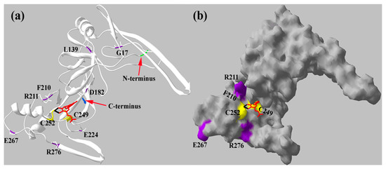 Thus far, the crystallographic 3D structure of mARC has not been resolved. Therefore, we observed in silico predicted structure of crARC (Figure 6) to locate the positions of the 8 amino acids, G17, L139, D182, F210, R211, E224, E267 and R276. In this predicted structure, we have also located the two amino acids, C252 and C249, which previously showed involvement in the Mo Cofactor binding to crARC [17].