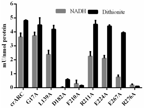 The variant R276A has no crARC reduction activity (Figure 7); however, the dithionite-dependent crARC reduction activity of the E267A was similar to the wild type. Also, mutants with similar reduction activity like G17A and E224A are monomers and oligomers respectively. These data indicate that the oligomerization state is not related to the crARC reduction activity.
