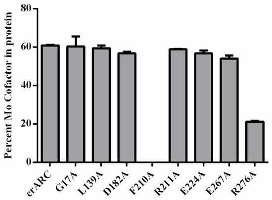 The amount of Mo Cofactor in the crARC variants was measured by high performance liquid chromatography (HPLC) using the Form A method. As shown in Figure 8, the mutants, G17A, L139A, D182A, R211A, E224A, and E267A showed very similar Mo Cofactor content as the wild type. It is very interesting that the variant D182A lost its reduction capacity with both dithionite and NADH (Figure 7); however, it contains the Mo Cofactor, which suggests two possibilities: (i) the Mo Cofactor bound to the variant D182A could not be in the proper form to accept the electrons form dithionite or from NADH; and (ii) the Mo Cofactor bound to the D182 variant could accept the electrons but was not able to donate them to the substrate, perhaps because the substrate could not bind properly. The variant R276A also lost its reduction capacity with dithionite and NADH (Figure 7), but still retained 30% of the Mo Cofactor content (Figure 8). This indicates that as well as in the variant D182A, the Mo Cofactor bound is not in the proper form to accept the electrons or to donate them to the substrate. Interestingly, the variant F210A was the only one studied with no Mo Cofactor bound at all. This indicates that the F210 is essential for Mo Cofactor binding, which explains the reason of not having crARC reduction activity. In summary, D182, F210 and R276 are necessary for mARC enzymatic activity; and for the Mo Cofactor chelation, R276 is important while F210 is essential.
