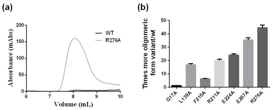 The chromatographic behavior in a SEC column of the crARC variants was also studied. Interestingly an oligomeric state has been observed in the human homolog hmARC1 [27]. Therefore, the oligomerization degree was studied to distinguish whether they were all monomers, just like the wild type (Figure 3a), or they might be some oligomers. Therefore, the wild type and the different crARC variants were loaded in a SEC column, and their chromatographic profiles were compared. As shown in Figure 3a the wild type crARC protein mostly behaves as a monomer with almost no peak eluting at around 8 mL. Interestingly, in some of the variants, a huge peak appeared at the volume of 8 mL. This peak can be observed in Figure 9a that shows the chromatographic profile of the wild type versus the variant R276A. The volume at which this peak appeared indicates an Mw of 1100 kDa, which corresponds to about 30 crARC units. Figure 9b represents the amount of oligomeric forms that appears in each of the mutants studied. The variants G17A and W128A look very similar to the wild protein without almost any oligomeric form. The variants with a higher percentage of the oligomeric state were E267A and R276A with around 40–50 times more aggregated than the wild type protein.