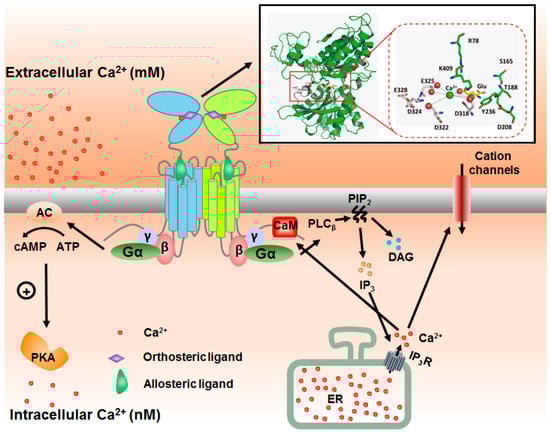 Ca2+, as a first and second messenger, regulates numerous cellular processes through temporal and spatial changes in its concentration and associated changes in the activity of Ca2+-receptor/binding proteins. Ca2+-binding proteins have Ca2+ affinities that vary by 106-fold or more depending on their cellular locations and functions [,,,,]. Ca2+ interacts with numerous Ca2+-binding receptors and Ca2+-dependent cell adhesion molecules in the extracellular environment with affinities between 0.1 and 10 mM (Kd), which correspond to the level of the Ca2+ concentrations in circulating fluids such as the blood, etc. []. Extracellular Ca2+ also functions as a first messenger to mediate numerous intracellular functions to trigger diverse cellular processes via family C of G protein-coupled receptors (cGPCR).