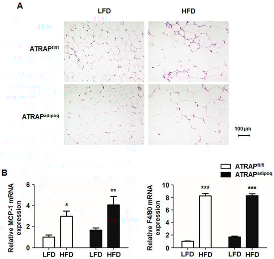 2.3. Effects of High-Fat Diet on Adipocyte Hypertrophy and Macrophage Infiltration in ATRAPfl/fl and ATRAPadipoq Mice