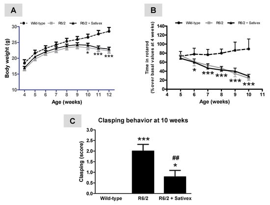 Despite the possibility of differences by gender in disease progression and treatment responses in R6/2 mice, our experiment was conducted exclusively in males to avoid a potential influence of ovarian steroid fluctuations when using females. Compared to wild-type animals, R6/2 mice exhibited a characteristic loss of weight gain that was initiated at 9 weeks of age and deteriorated at 10–11 weeks and up to 12 weeks of age when animals were euthanized (age: F(8,200) = 279.1, p < 0.0001; genotype/treatment: F(2,200) = 4.497, p < 0.05; interaction: F(16,200) = 10.64, p < 0.0001; Figure 1A). This loss of weight has been widely reported in R6/2 mice [,] and also in other transgenic models of HD [,]. In parallel, there was a deterioration in rotarod performance that was already evident at the age of 6 weeks after birth, then occurring before the loss of weight, and reaching its maximum at the last age analyzed (10 weeks after birth) (age: F(5,139) = 21.57, p < 0.0001; genotype/treatment: F(2,139) = 187.3, p < 0.0001; interaction: F(10,139) = 15.30, p < 0.0001; Figure 1B). The treatment with the Sativex-like combination of phytocannabinoids did not produce any recovery in both rotarod performance and weight gain (Figure 1A,B). By contrast, the Sativex-like combination of phytocannabinoids was highly effective in attenuating clasping behavior detected in R6/2 mice at the age of 10 weeks (F(2,17) = 13.88, p < 0.0005; <95% confidence intervals for wild-type mice, and R6/2 animals treated with vehicle or Sativex-like combination of phytocannabinoids were 0, 1.12. and 0.04, respectively; >95% confidence intervals were 0, 2.88, and 1.53, respectively; Figure 1C), a response that reflects dystonia and is absent in wild-type animals. The statistical relevance of these differences was confirmed using different post-hoc assays (Student-Newman-Keuls, Tukey, and Bonferroni), all reaching similar statistics.