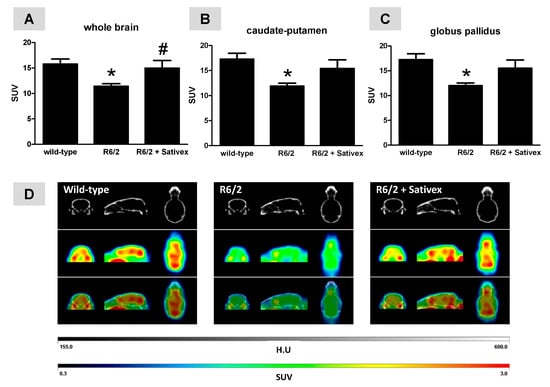 In vivo glucose metabolic rates measured by positron emission tomography (PET) analysis in the whole brain (A), caudate-putamen (B), and globus pallidus (C), including representative PET images in (D) of R6/2 mice (at 10 weeks after birth) treated from the age of 4 weeks after birth with ∆9-THC- and CBD-enriched botanical extracts combined in a Sativex®-like ratio 1:1 (4.5 mg/kg equivalent to 3 mg/kg of pure CBD + ∆9-THC), or vehicle (Tween 80-saline), and the corresponding wild-type animals. Details in the text. Values correspond to standard uptake value (SUV) and are expressed as means ± SEM of five subjects per group and age. Data were subjected to one-way analysis of variance followed by the Student-Newman-Keuls test (* p < 0.05 compared with wild-type mice; # p < 0.05 compared to R6/2 mice treated with vehicle).