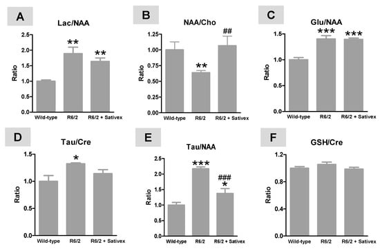 These positive effects prompted us to extend our research to transgenic mouse models of HD, specifically the R6/2 mice, which are frequently used for the evaluation of potential neuroprotective compounds that warrant investigation at the clinical level. To this end, we subjected R6/2 mice to daily treatment with Sativex-like combination of phytocannabinoids (equivalent to 3 mg/kg weight of pure CBD + ∆9-THC) or with vehicle. Treatments commenced at 4 weeks and were prolonged up to 12 weeks after birth, the age at which animals were euthanized. The progression of neurological deficits (e.g., rotarod performance) was recorded during the treatment period, whereas additional motor markers (e.g., clasping behavior) were recorded just before animals were euthanized together with the in vivo imaging analysis of local metabolic activity using positron emission tomography (PET). Once euthanized, brains were collected and the striatum dissected and used for ex vivo proton magnetic resonance spectroscopy (H+-MRS) analysis, which provides a series of detectable biomarkers reflecting: (i) oxidative damage (e.g., reduced glutation/creatine ratio (GSH/Cre)); (ii) energy failure (e.g., elevated lactate/N-acetyl-aspartate ratio (Lac/NAA), reduced NAA/choline ratio (NAA/Cho)); (iii) excitotoxicity (e.g., increased glutamate/NAA ratio (Glu/NAA)); and (iv) other events typically found in HD (e.g., taurine/Cre ratio (Tau/Cre), Tau/NAA ratio, all of them being relatively prognostic for brain integrity/damage) [,,,,,].