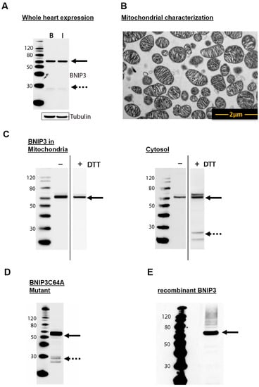 Figure 1. Localization of BCL-2 adenovirus E1B 19 kDa-interacting protein 3 (BNIP3). (A) Immunoblot analysis of BNIP3 under reducing conditions in whole mouse heart under basal conditions (B) and after 30 min of myocardial ischemia (I) (n = 9). BNIP3 could be detected in a 60 kDa dimeric form and a 30 kDa monomeric form; (B) Examination of isolated mitochondria from whole mouse hearts using electron microscopy (magnification 4800×) (n = 3). Pure mitochondria could be isolated in high concentrations; (C) Immunoblot analysis of BNIP3 in separated mitochondrial and cytoplasmic fractions from whole mouse hearts under non-reducing and reducing (50 mM dithiothreitol) conditions (n = 3); (D) Immunoblot analysis of BNIP3 mutant C64A under reduced conditions (n = 3); (E) Immunoblot analysis of recombinant murine BNIP3 under reduced conditions (n = 3). Black arrows mark the dimeric and dashed arrows the monomeric protein form.