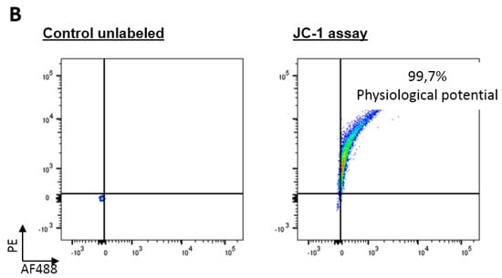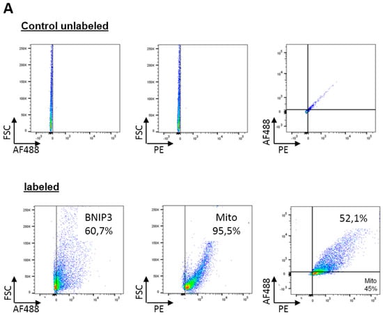 Figure 2. Impact of BNIP3 on mitochondria and cell integrity. (A) Flow cytometry analyses of isolated mouse heart mitochondria. The upper dot plots show the particular unlabeled controls. BNIP3 were labeled using AF488 and mitochondria using MitoTracker (Phycoerythrin (PE)-labeled) (n = 3). A total of 52.1% of mitochondria showed double positive; (B) Measurement of the mitochondrial inner membrane potential from isolated mouse heart mitochondria under basal conditions using 5,5′,6,6′-tetrachloro-1,1′,3,3′-tetraethylenbenzimidazolylcarbocyanin iodid (JC-1) fluorescence-activated cell sorting (FACS) assay. The left dot plots show the unlabeled controls and the right dot plots the labeled mitochondria (n = 5).