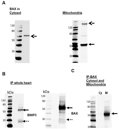 Figure 3. BNIP3 interacts with BAX in murine heart cells. (A) Immunoblot analysis of BAX in separated cytosolic and mitochondrial fractions from whole murine hearts under reduced conditions (n = 3); (B) Co-immunoprecipitation reveals an interaction of BNIP3 and BAX. Protein lysates from whole mouse hearts were precipitated with BAX (left panel) and BNIP3 (right panel) labeled dynabeads and analyzed using an immunoblot technique to detect the binding partner (n = 5); (C) Investigation of BNIP3 and BAX interactions in separated cytosolic (Cy) and mitochondrial (M) fractions using co-immunoprecipitation with BAX antibody (n = 3). Rude dashed arrows mark the oligomeric, black arrows the dimeric and dashed arrows the monomeric protein form.