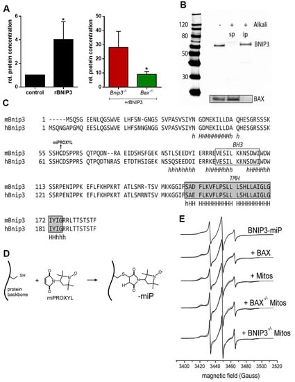 Figure 4. BNIP3 interacts with mitochondria via BAX. (A) Incubation of mitochondria with recombinant BNIP3 (rBNIP3) leads to a significant increase of the BNIP3 protein concentration in mitochondria (left panel; one-tailed ANOVA; n = 3; * p = 0.0124). Incubation of Bnip3−/− mitochondria with rBNIP3 also leads to a strong increase of the BNIP3 protein content in the organelles, whereas rBNIP3 incorporates to a significantly lower extent into Bax−/− mitochondria (right panel). One tailed ANOVA (n = 2/3; p = 0.0268); (B) Immunoblot analyses after alkali extraction of mitochondria show that BNIP3 is an integral membrane protein. Contrarily, BAX is found in the soluble protein fraction after alkali treatment (sp = soluble proteins; ip = integral proteins); (C) Primary sequences of murine (m)BNIP3 and human (h)BNIP3 (aligned with ClustalW 1.83) with secondary structure predictions (HHpred). The locations of the Bcl-2 homology 3(BH3) domain and the transmembrane helix (TMH) are indicated. Spin labeling of mBNIP3 at the native Cys58 has been carried out with 3-Maleimido-PROXYL (miP); (D) Reaction of the maleimide spin label with a cysteine side chain; (E) X band continuous wave electron paramagnetic resonance spectra for BNIP3-wild-type-miP (from top to bottom) alone, in the presence of BAX and incubated with isolated mouse heart mitochondria from wild-type (wt), Bax−/− and Bnip3/− mice. All spectra have been recorded at room temperature (298 K) (n = 2).