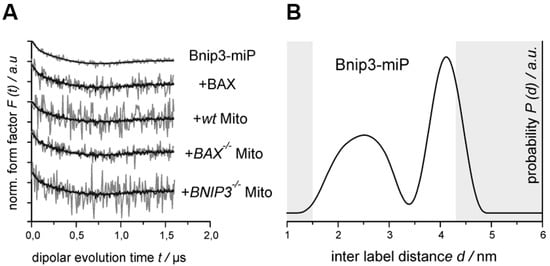 Figure 5. Double-electron-electron resonance (DEER) inter spin distance measurements. (A) Background corrected DEER dipolar evolution traces for (from top to bottom) rBNIP3-miP, rBNIP3-miP + recombinant BAX (rBAX), rBNIP3-miP + wt mitochondria, and with Bax−/− and Bnip3−/− mitochondria, with fits (thick lines) obtained by Tikhonov regularization (n = 2); (B) Inter spin distance distribution for rBNIP3-miP. The grey shaded areas indicate parts of the distance distribution that are not reliable due to experimental limitations (n = 2).