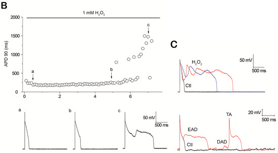As shown in Figure 1, H2O2 perfusion prolonged APD gradually and induced afterdepolarizations and TAs after approximately 7 min, while control experiments in parallel (without H2O2) showed that no electrical abnormalities occurred for up to 15 min (n = 9). APD 90 was prolonged from 276.7 ± 77.4 to 585.0 ± 65.0 ms (n = 9, p < 0.01) at 5 min of application of 1 mM H2O2. Examples of afterdepolarizations and TAs are shown in Figure 1C.