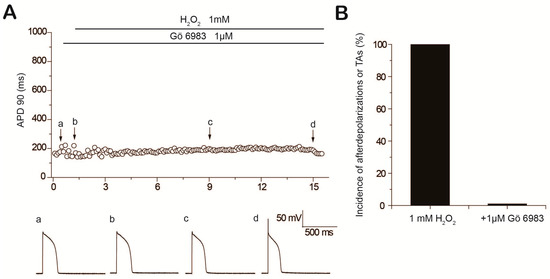 Prevention of H2O2-induced early afterdepolarizations (EADs) by the protein kinase C inhibitor Gö 6983. (A) Time course of action potential duration (APD) 90 in a myocyte treated with Gö 6983 before exposure to 1 mM H2O2. Action potentials under control conditions (a), in the presence of Gö 6983 (b); after perfusion of H2O2 for 8 min (c) and 14 min (d) are shown below; (B) Incidence of EADs, delayed afterdepolarizations (DADs) or triggered activities (TAs) in the presence of H2O2 and pretreated with Gö 6983.